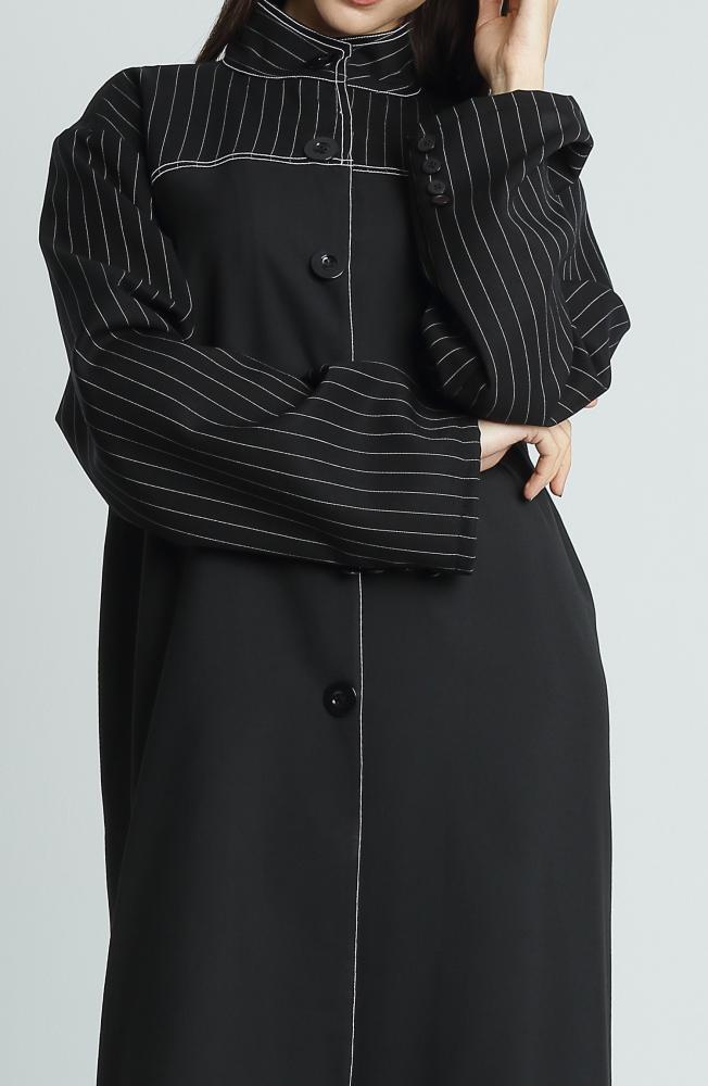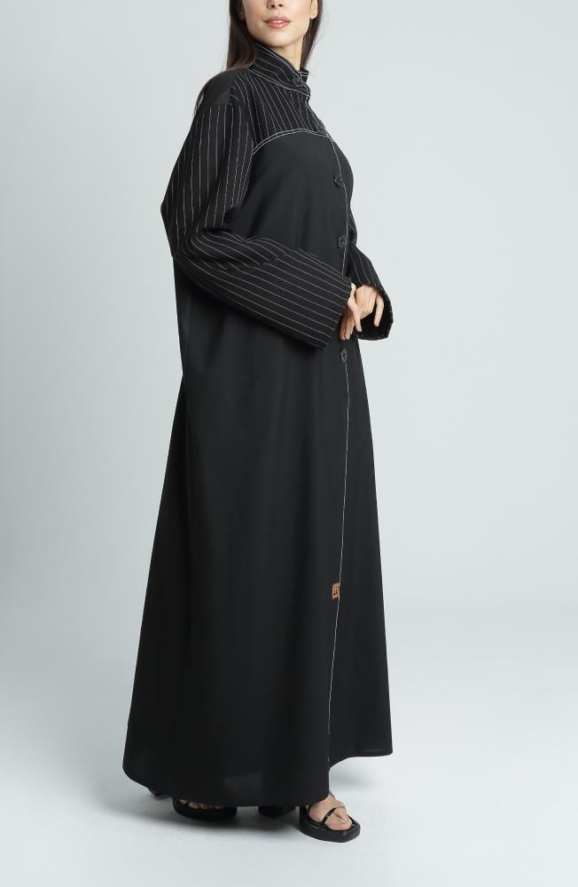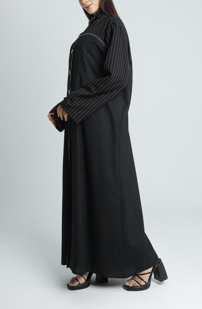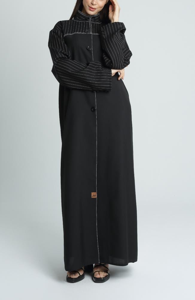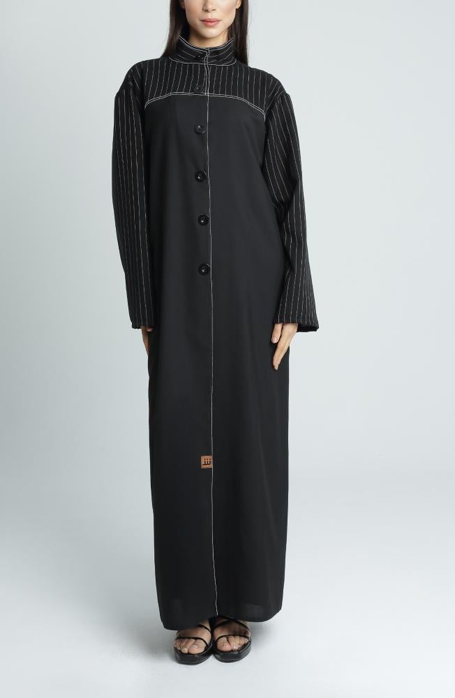 عباية أنيقة وعصرية تتميز بتصميمها المستوحى من الخطوط الكلاسيكية مع لمسة عصرية ناعمة. تأتي العباية بقصة ربع كلوش تمنحها انسيابية وجاذبية عند الحركة، وتضيف لمسة فريدة من الأنوثة الراقية. تم تصنيعها من قماش ميني مات المعروف بخفته وملمسه الناعم، مما يمنحك راحة طوال اليوم. أما التفاصيل في الأكمام والياقة، فهي مصنوعة من قماش جبردين مقلم عالي الجودة يضفي أناقة استثنائية ويعزز التباين البصري للعباية.