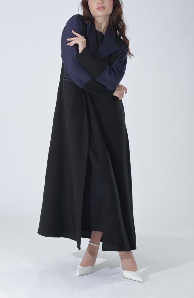 - قبة بليزر بتفاصيل رسمية: تمنح العباية طابعاً عملياً وأنيقاً يناسب أجواء العمل.