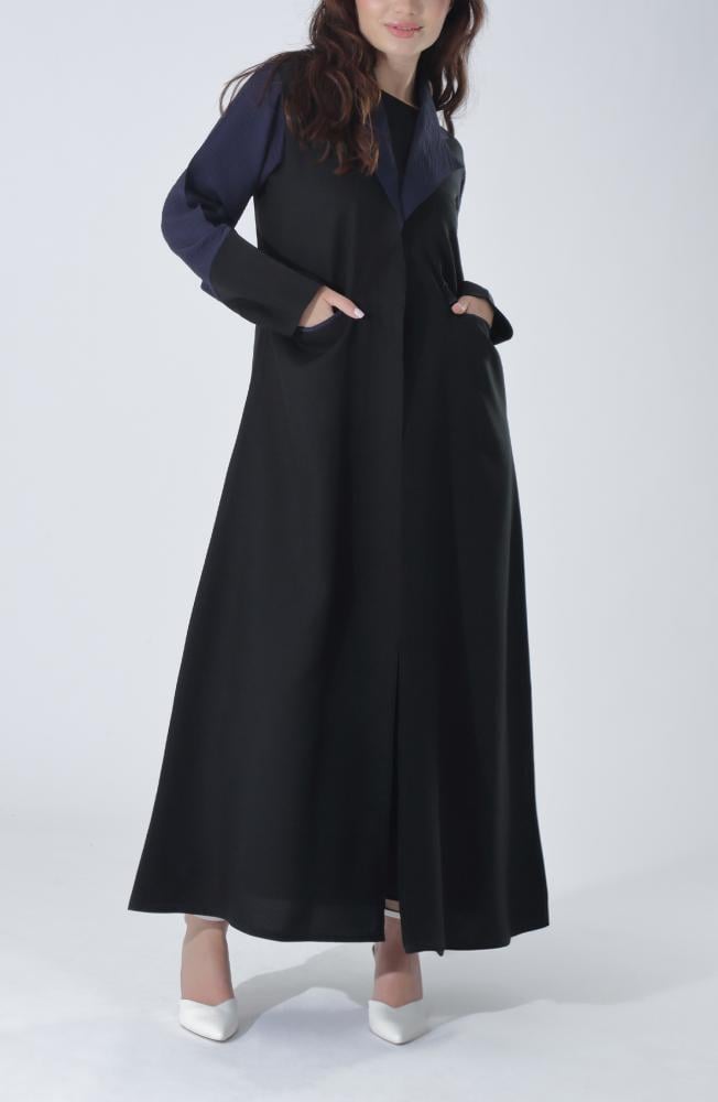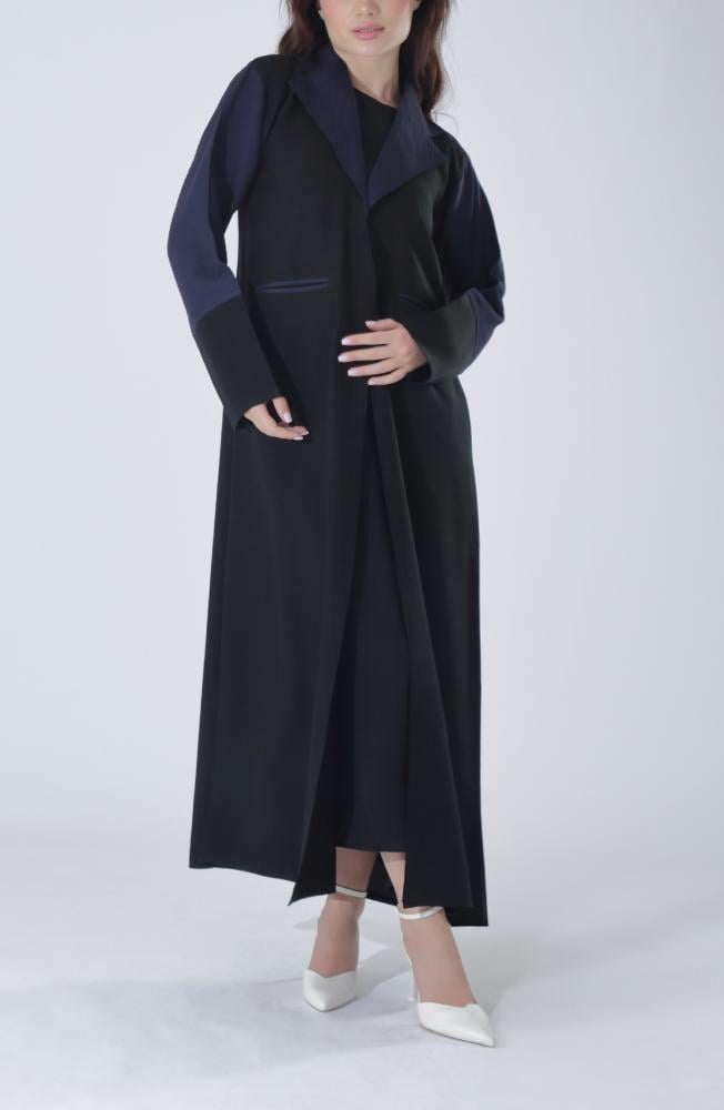 ارتقي بإطلالتك اليومية مع هذه العباية المصنوعة من قماش الميني مات الفاخر، المعروف بملمسه الناعم ومرونته العالية. تصميم أنيق يجمع بين اللون الأسود الكلاسيكي والتفاصيل الكحلية على الأكمام والجيوب، مما يضفي لمسة من الحيوية والرقي. القبة البليزر تضيف لمسة رسمية راقية تجعل العباية مثالية لمناسبات العمل والاجتماعات، دون التنازل عن الراحة والعملية