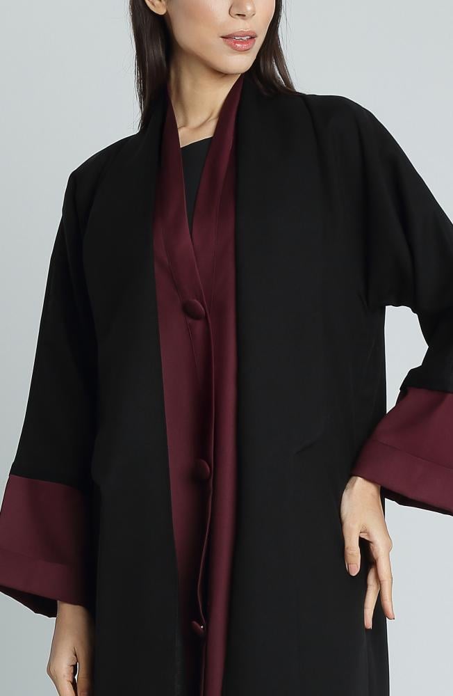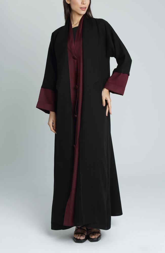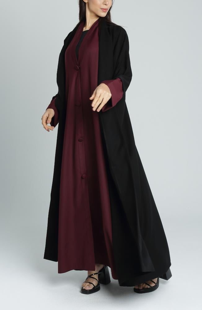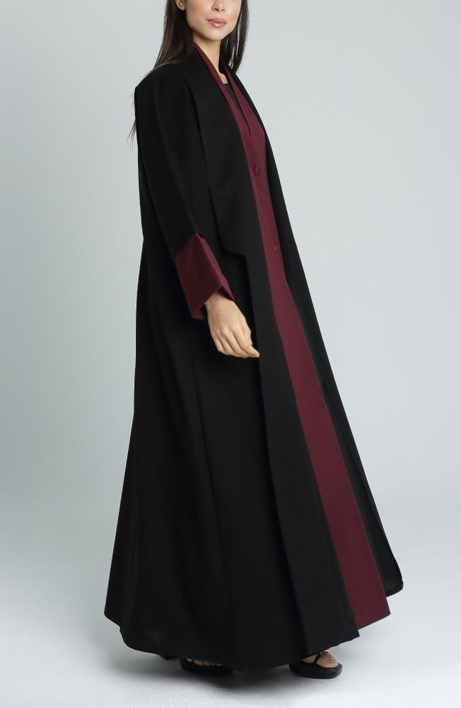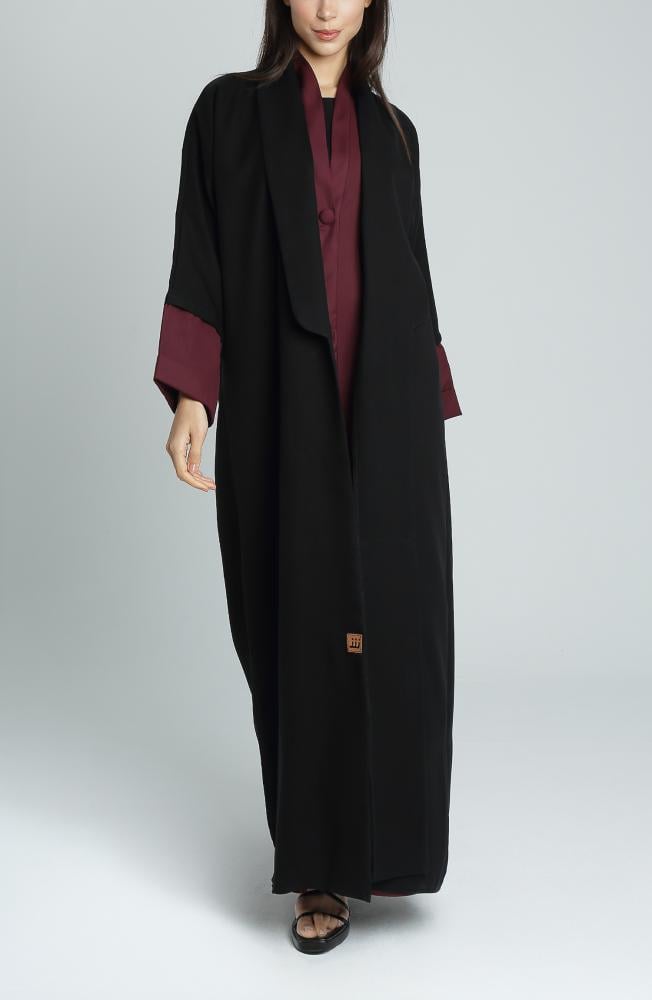 عباية أنيقة بتصميم كلاسيكي وعصري في آنٍ واحد، مصنوعة من قماش ميني مات المعروف بثبات لونه وجودته العالية. يجمع هذا التصميم بين اللون الأسود الراقي من الخارج واللون الجولدن عودي المميز من الداخل، مما يمنح العباية طابعاً فاخراً وإطلالة راقية. بفضل القصة الربع كلوش، تمنح العباية حرية حركة وأناقة مثالية تناسب المرأة العصرية في جميع الأوقات