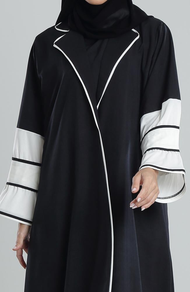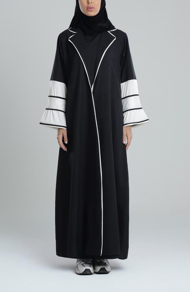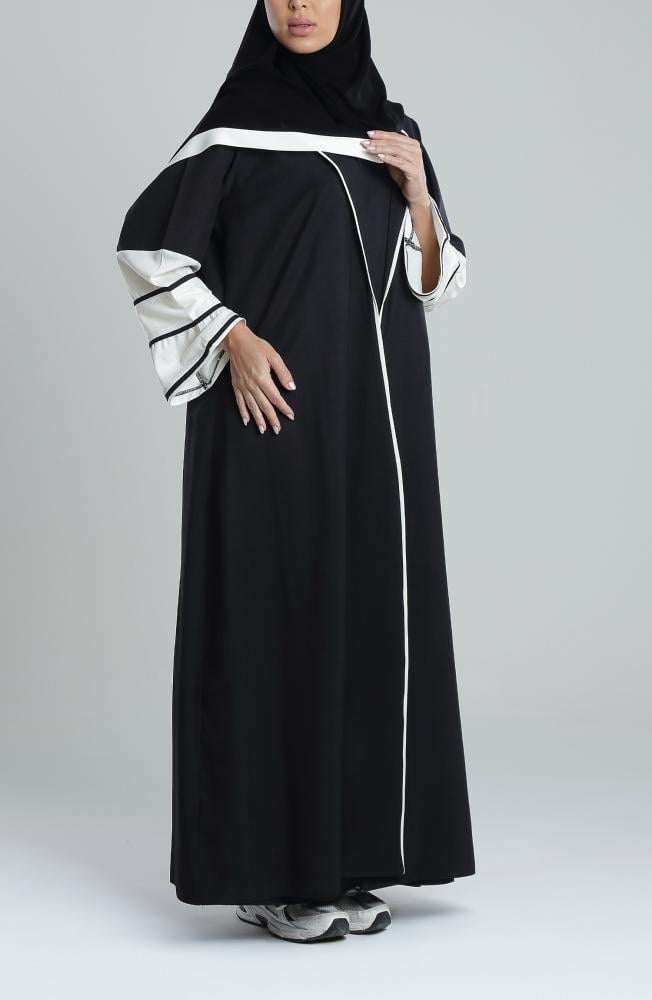 عباية فاخرة وعصرية بتفاصيل هندسية أنيقة تمنحك إطلالة فريدة. صُممت باللون الأسود الكلاسيكي مع لمسات بيضاء على الأكمام والخط الأمامي، لتضفي تبايناً ملفتاً. خامة الميني مات المختارة بعناية تضمن لكِ مظهراً أنيقاً وراحة مثالية طوال اليوم، بفضل ملمسها الناعم وثقلها المتوسط المناسب لمختلف المواسم. هذا الموديل مثالي للمرأة التي تبحث عن عباية سوداء رسمية أو كاجوال تناسب مختلف المناسبات.