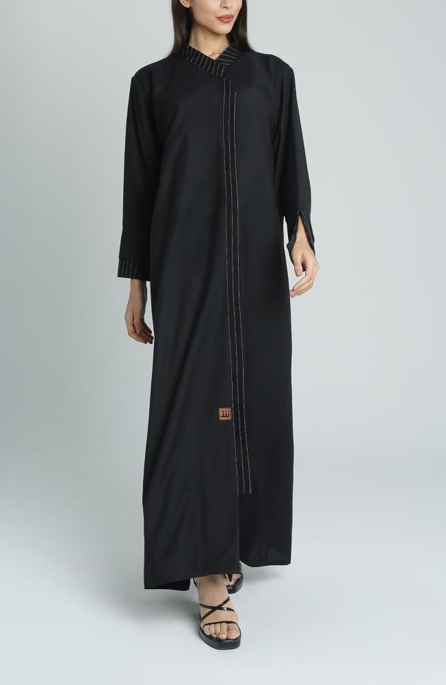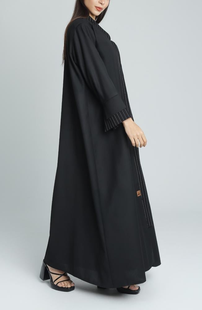 تجمع هذه العباية بين التصميم الكلاسيكي واللمسات العصرية بامتياز، حيث صُممت بقصة ربع كلوش لتمنحك حرية الحركة وأناقة المظهر. صنعت العباية من قماش ميني مات الفاخر، المعروف بنعومته ومتانته وسهولة العناية به. يزين التصميم لمسات أنيقة من قماش الجبردين المقلم على الياقة والأكمام، ما يضيف لها طابعاً مميزاً. تم تنفيذ الأكمام بطبقتين وبقصّة مفتوحة، لتضفي طابعاً عصرياً وجذاباً يُناسب الأذواق المتجددة.